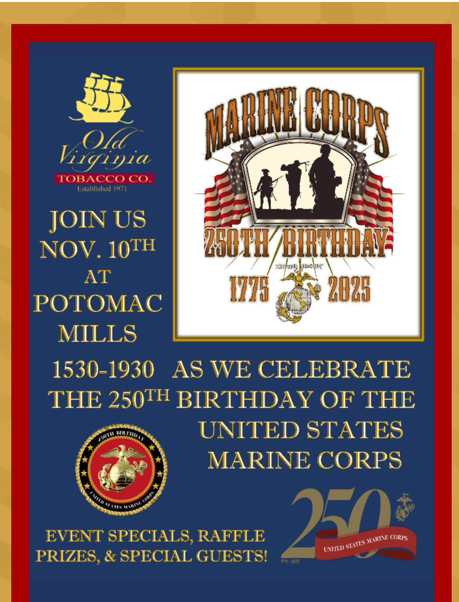 Potomac Mills – Monday Nov 10th 3:30-7:30 to celebrate the 250th birthday of Marine Corps